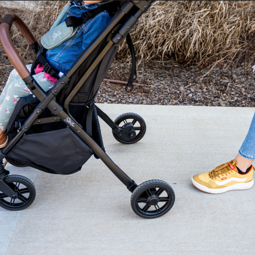 Stroll in comfort with Strolee's unique design that removes the rear axle, ensuring tall parents can walk freely without kicks, making every walk a breeze.